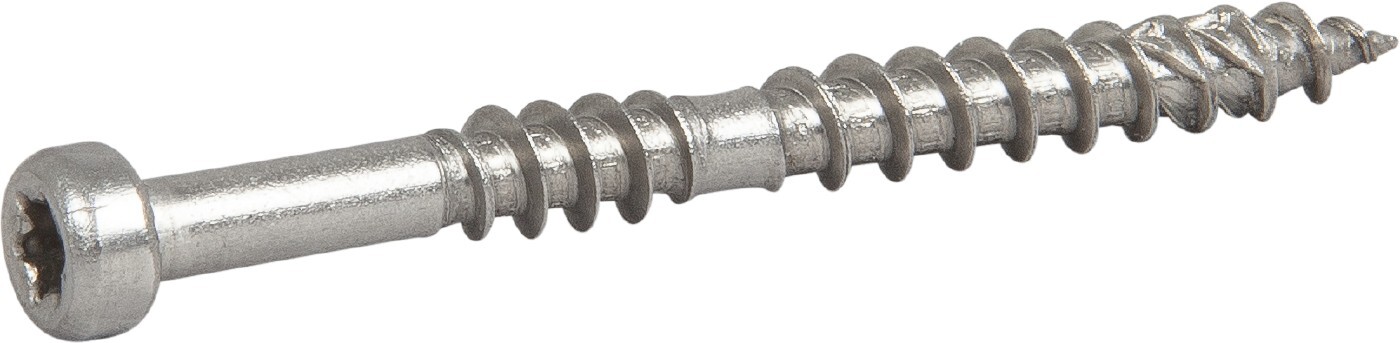 ESSVE Шуруп нержавіючий А2 для дерев'яного настилу ESSDECK Max призначений для встановлення терасного настилу, огорожі та дерев'яних балок. Гвинт для роботи на об'єктах з більш високими вимогами, такими як настили великої площі, багаторівневі настили, що дощаті, і палуби, які піддаються великій кількості рухів. Оснащений TX-шліцем. Гвинт має фрезер на початку різьблення, що усуває необхідність попереднього свердління (за винятком екзотичних порід деревини). Шуруп має верхнє дотискне різьблення, яке створює додаткове зусилля, щоб допомогти розправити розшиті дошки. При монтажі затискне різьблення допомагає утримувати дошку на місці, дозволяючи використовувати головку меншого розміру з такою ж або більш високою силою, що утримує, ніж традиційні настилові гвинти. Головка гвинта має циліндричну форму з нижніми фрезерними ребрами, що дозволяє отримати потайний отвір без сколів. Перевага циліндричної головки полягає в тому, що вона не створює зусилля, що розколює, в дошці. Рекомендована швидкість при монтажі: 400-1200 об/хв.